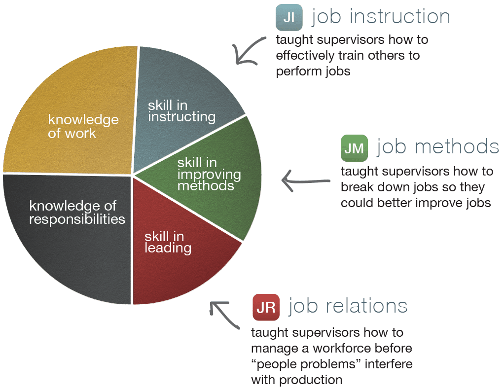 These industry experts identified five needs of a supervisor – two were knowledge-related and three were skills-based needs. A series of 10-hour training classes were created for workplace supervisors, each aimed to close the most glaring skills gaps. The best known of these classes are called Job Instruction, Job Methods, and Job Relations. You can see the purpose of each class described in the figure below.
